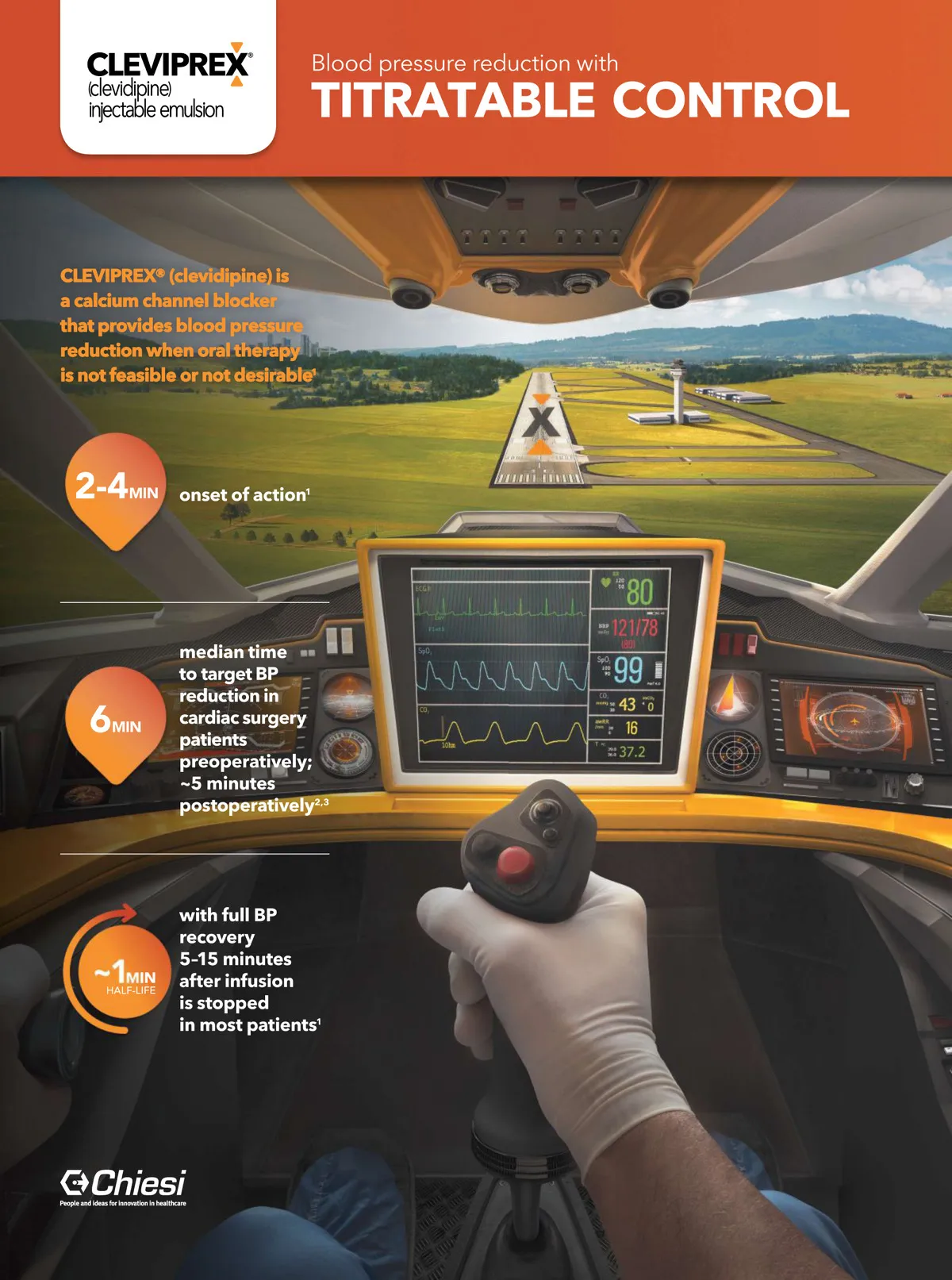 Blood pressure reduction with TITRATABLE CONTROL CLEVIPREX® (clevidipine) is a calcium channel blocker that provides blood pressure reduction when oral therapy is not feasible or not desirable 1 2-4 MIN onset of action 1 6 MIN median time to target BP reduction in cardiac surgery patients preoperatively; ~5 minutes postoperatively 2,3 HALF-LIFE with full BP recovery 5–15 minutes after infusion is stopped in most patients 1