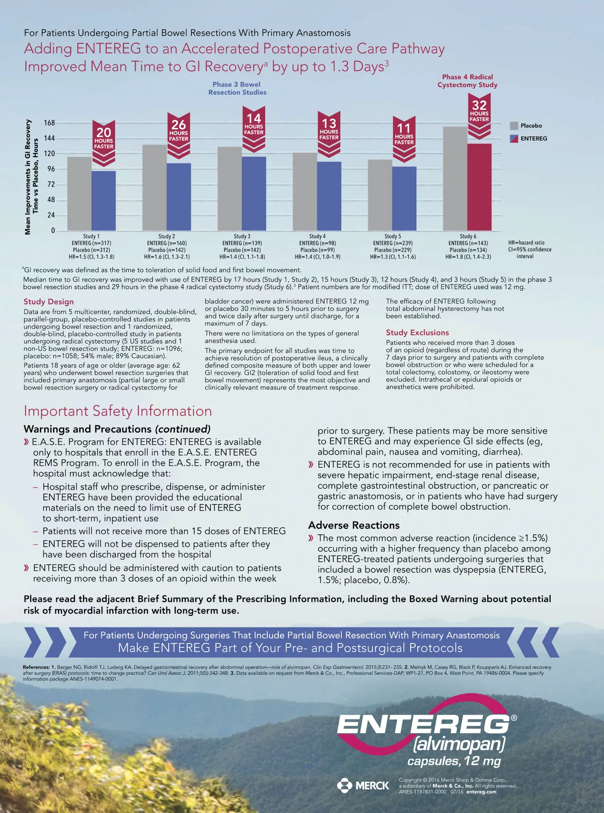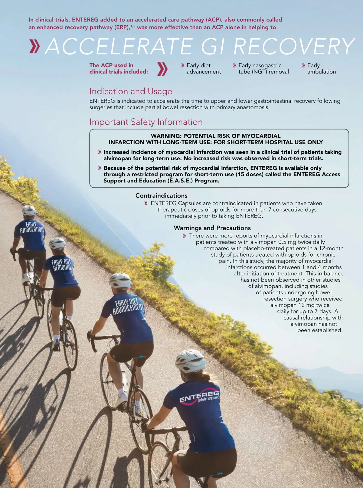 In clinical trials, ENTEREG added to an accelerated care pathway (ACP), also commonly called an enhanced recovery pathway (ERP), 1,2 was more effective than an ACP alone in helping to ACCELERATE GI RECOVERY The ACP used in clinical trials included: Early diet advancement Early nasogastric tube (NGT) removal Early ambulation Indication and Usage ENTEREG is indicated to accelerate the time to upper and lower gastrointestinal recovery following surgeries that include partial bowel resection with primary anastomosis. Important Safety Information WARNING: POTENTIAL RISK OF MYOCARDIAL INFARCTION WITH LONG-TERM USE: FOR SHORT-TERM HOSPITAL USE ONLY Increased incidence of myocardial infarction was seen in a clinical trial of patients taking alvimopan for long-term use. No increased risk was observed in short-term trials. Because of the potential risk of myocardial infarction, ENTEREG is available only through a restricted program for short-term use (15 doses) called the ENTEREG Access Support and Education (E.A.S.E.) Program. Contraindications ENTEREG Capsules are contraindicated in patients who have taken therapeutic doses of opioids for more than 7 consecutive days immediately prior to taking ENTEREG. Warnings and Precautions There were more reports of myocardial infarctions in patients treated with alvimopan 0.5 mg twice daily compared with placebo-treated patients in a 12-month study of patients treated with opioids for chronic pain. In this study, the majority of myocardial infarctions occurred between 1 and 4 months after initiation of treatment. This imbalance has not been observed in other studies of alvimopan, including studies of patients undergoing bowel resection surgery who received alvimopan 12 mg twice daily for up to 7 days. A causal relationship with alvimopan has not been established.