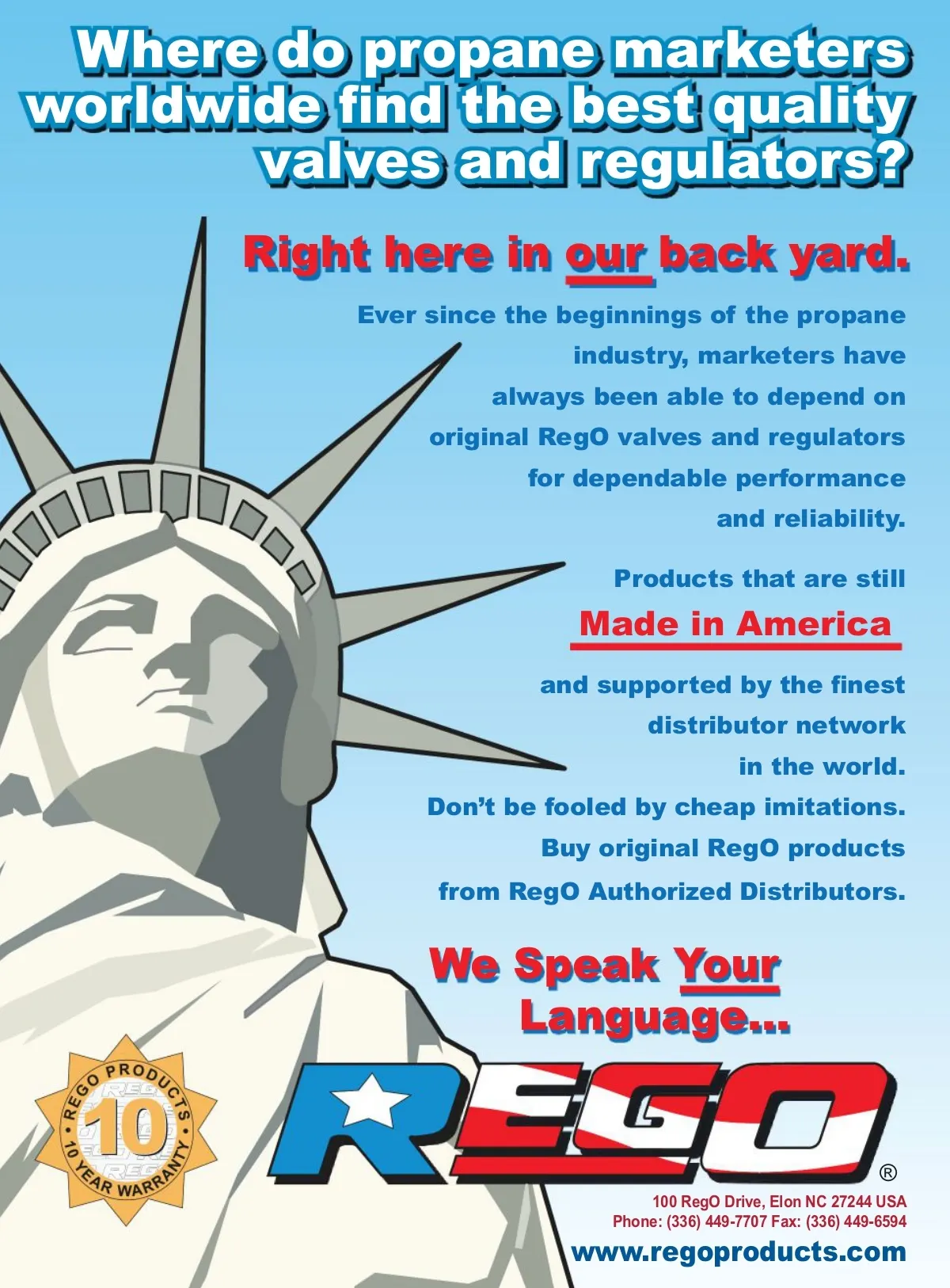 Where do propane marketers Z RUOG Z LGH ÀQ G  WKH  EHVW  TXDOLW \ valves and regulators? Right here in our back yard. Ever since the beginnings of the propane industry, marketers have always been able to depend on original RegO valves and regulators for dependable performance and reliability. Products that are still Made in America D Q G  VXSSRUWHG  E \ WKH ÀQ HVW  distributor network in the world. Don’t be fooled by cheap imitations. Buy original RegO products from RegO Authorized Distributors. We Speak Your Language... ® 100 RegO Drive, Elon NC 27244 USA Phone: (336) 449-7707 Fax: (336) 449-6594 www.regoproducts.com
