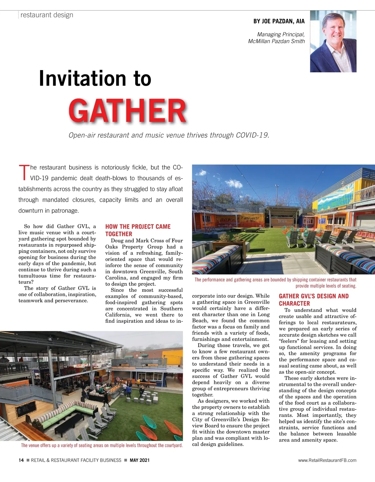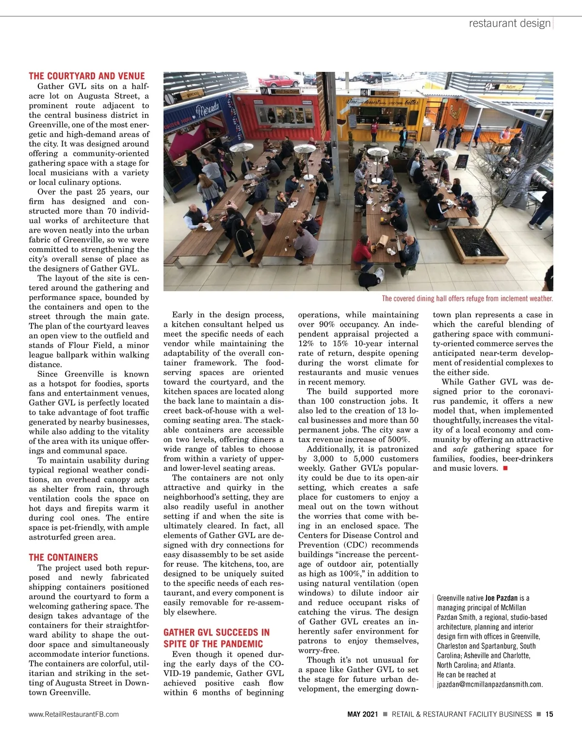 restaurant design BY JOE PAZDAN, AIA Managing Principal, McMillan Pazdan Smith Invitation to GATHER Open-air restaurant and music venue thrives through COVID-19. T he restaurant business is notoriously fi ckle, but the CO-VID-19 pandemic dealt death-blows to thousands of es-tablishments across the country as they struggled to stay afl oat through mandated closures, capacity limits and an overall downturn in patronage. So how did Gather GVL, a live music venue with a court-yard gathering spot bounded by restaurants in repurposed ship-ping containers, not only survive opening for business during the early days of the pandemic, but continue to thrive during such a tumultuous time for restaura-teurs? The story of Gather GVL is one of collaboration, inspiration, teamwork and perseverance. HOW THE PROJECT CAME TOGETHER Doug and Mark Cross of Four Oaks Property Group had a vision of a refreshing, family-oriented space that would re-inforce the sense of community in downtown Greenville, South Carolina, and engaged my fi rm to design the project. Since the most successful examples of community-based, food-inspired gathering spots are concentrated in Southern California, we went there to fi nd inspiration and ideas to in-The performance and gathering areas are bounded by shipping container restaurants that provide multiple levels of seating. corporate into our design. While a gathering space in Greenville would certainly have a differ-ent character than one in Long Beach, we found the common factor was a focus on family and friends with a variety of foods, furnishings and entertainment. During those travels, we got to know a few restaurant own-ers from these gathering spaces to understand their needs in a specifi c way. We realized the success of Gather GVL would depend heavily on a diverse group of entrepreneurs thriving together. As designers, we worked with the property owners to establish a strong relationship with the City of Greenville’s Design Re-view Board to ensure the project fi t within the downtown master plan and was compliant with lo-cal design guidelines. GATHER GVL’S DESIGN AND CHARACTER The venue offers up a variety of seating areas on multiple levels throughout the courtyard. 14 RETAIL & RESTAURANT FACILITY BUSINESS MAY 2021 To understand what would create usable and attractive of-ferings to local restaurateurs, we prepared an early series of accurate design sketches we call “feelers” for leasing and setting up functional services. In doing so, the amenity programs for the performance space and ca-sual seating came about, as well as the open-air concept. These early sketches were in-strumental to the overall under-standing of the design concepts of the spaces and the operation of the food court as a collabora-tive group of individual restau-rants. Most importantly, they helped us identify the site’s con-straints, service functions and the balance between leasable area and amenity space. www.RetailRestaurantFB.com