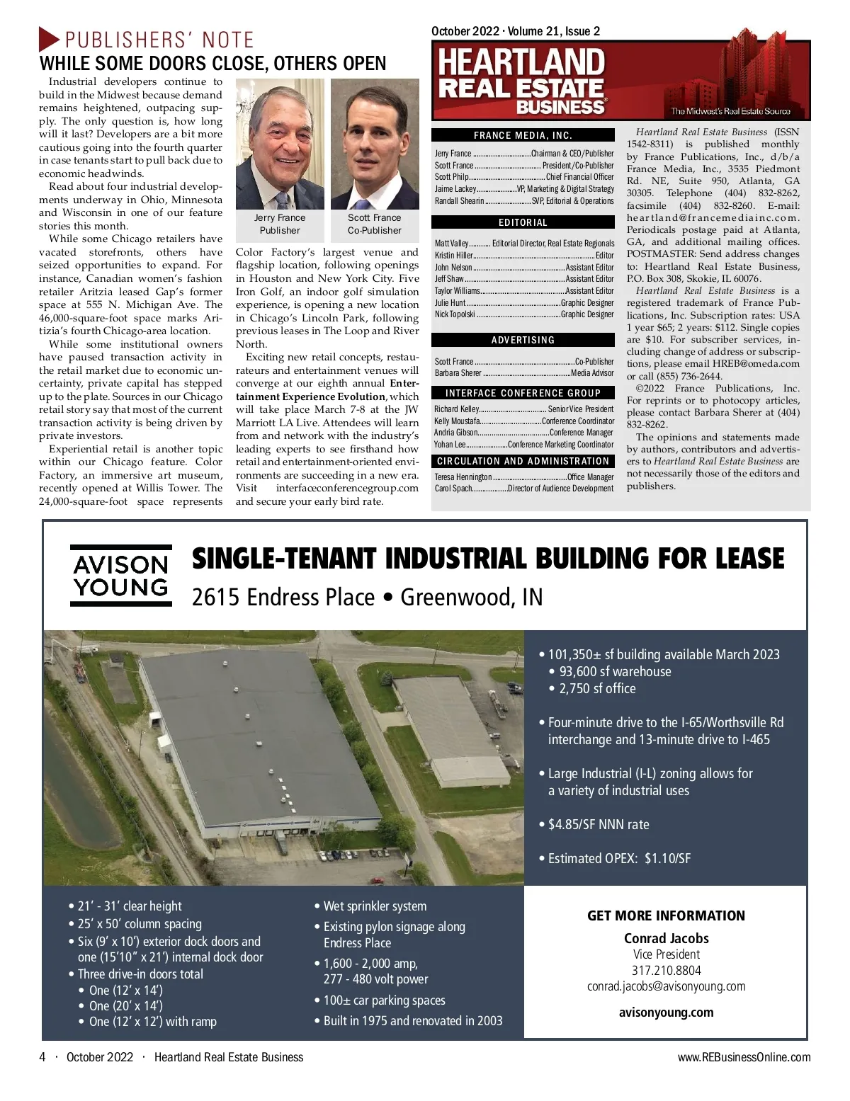 Industrial developers continue to build in the Midwest because demand remains heightened, outpacing sup-ply. The only question is, how long will it last? Developers are a bit more cautious going into the fourth quarter in case tenants start to pull back due to economic headwinds. Read about four industrial develop-ments underway in Ohio, Minnesota and Wisconsin in one of our feature stories this month. While some Chicago retailers have vacated storefronts, others have seized opportunities to expand. For instance, Canadian women’s fashion retailer Aritzia leased Gap’s former space at 555 N. Michigan Ave. The 46,000-square-foot space marks Ari-tizia’s fourth Chicago-area location. While some institutional owners have paused transaction activity in the retail market due to economic un-certainty, private capital has stepped up to the plate. Sources in our Chicago retail story say that most of the current transaction activity is being driven by private investors. Experiential retail is another topic within our Chicago feature. Color Factory, an immersive art museum, recently opened at Willis Tower. The 24,000-square-foot space represents PUBLISHERS’ NOTE WHILE SOME DOORS CLOSE, OTHERS OPEN October 2022 • Volume 21, Issue 2 FRANCE MEDIA, INC. Jerry France .............................Chairman & CEO/Publisher Scott France ................................. President/Co-Publisher Scott Philp ...................................... Chief Financial Of cer Jaime Lackey ....................VP, Marketing & Digital Strategy Randall Shearin .......................SVP, Editorial & Operations Jerry France Publisher Scott France Co-Publisher EDITORIAL Matt Valley ........... Editorial Director, Real Estate Regionals Kristin Hiller .............................................................Editor John Nelson .............................................. Assistant Editor Jeff Shaw .................................................. Assistant Editor Taylor Williams...........................................Assistant Editor Julie Hunt ...............................................Graphic Designer Nick Topolski ..........................................Graphic Designer Color Factory’s largest venue and agship location, following openings in Houston and New York City. Five Iron Golf, an indoor golf simulation experience, is opening a new location in Chicago’s Lincoln Park, following previous leases in The Loop and River North. Exciting new retail concepts, restau-rateurs and entertainment venues will converge at our eighth annual Enter-tainment Experience Evolution , which will take place March 7-8 at the JW Marriott LA Live. Attendees will learn from and network with the industry’s leading experts to see rsthand how retail and entertainment-oriented envi-ronments are succeeding in a new era. Visit interfaceconferencegroup.com and secure your early bird rate. ADVERTISING Scott France ..................................................Co-Publisher Barbara Sherer ............................................Media Advisor INTERFACE CONFERENCE GROUP Richard Kelley .................................. Senior Vice President Kelly Moustafa...............................Conference Coordinator Andria Gibson....................................Conference Manager Yohan Lee.....................Conference Marketing Coordinator CIRCULATION AND ADMINISTRATION Teresa Hennington .....................................Of ce Manager Carol Spach..................Director of Audience Development Heartland Real Estate Business (ISSN 1542-8311) is published monthly by France Publications, Inc., d/b/a France Media, Inc., 3535 Piedmont Rd. NE, Suite 950, Atlanta, GA 30305. Telephone (404) 832-8262, facsimile (404) 832-8260. E-mail: heartland@francemediainc.com. Periodicals postage paid at Atlanta, GA, and additional mailing of ces. POSTMASTER: Send address changes to: Heartland Real Estate Business, P.O. Box 308, Skokie, IL 60076. Heartland Real Estate Business is a registered trademark of France Pub-lications, Inc. Subscription rates: USA 1 year $65; 2 years: $112. Single copies are $10. For subscriber services, in-cluding change of address or subscrip-tions, please email HREB@omeda.com or call (855) 736-2644. ©2022 France Publications, Inc. For reprints or to photocopy articles, please contact Barbara Sherer at (404) 832-8262. The opinions and statements made by authors, contributors and advertis-ers to Heartland Real Estate Business are not necessarily those of the editors and publishers. SINGLE-TENANT INDUSTRIAL BUILDING FOR LEASE 2615 Endress Place • Greenwood, IN • 101,350± sf building available March 2023 • 93,600 sf warehouse • 2,750 sf office • Four-minute drive to the I-65/Worthsville Rd interchange and 13-minute drive to I-465 • Large Industrial (I-L) zoning allows for a variety of industrial uses • $4.85/SF NNN rate • Estimated OPEX: $1.10/SF • 21’ -31’ clear height • 25’ x 50’ column spacing • Six (9’ x 10’) exterior dock doors and one (15’10” x 21’) internal dock door • Three drive-in doors total • One (12’ x 14’) • One (20’ x 14’) • One (12’ x 12’) with ramp 4 • October 2022 • Heartland Real Estate Business • Wet sprinkler system • Existing pylon signage along Endress Place • 1,600 -2,000 amp, 277 -480 volt power • 100± car parking spaces • Built in 1975 and renovated in 2003 GET MORE INFORMATION Conrad Jacobs Vice President 317.210.8804 conrad.jacobs@avisonyoung.com avisonyoung.com www.REBusinessOnline.com