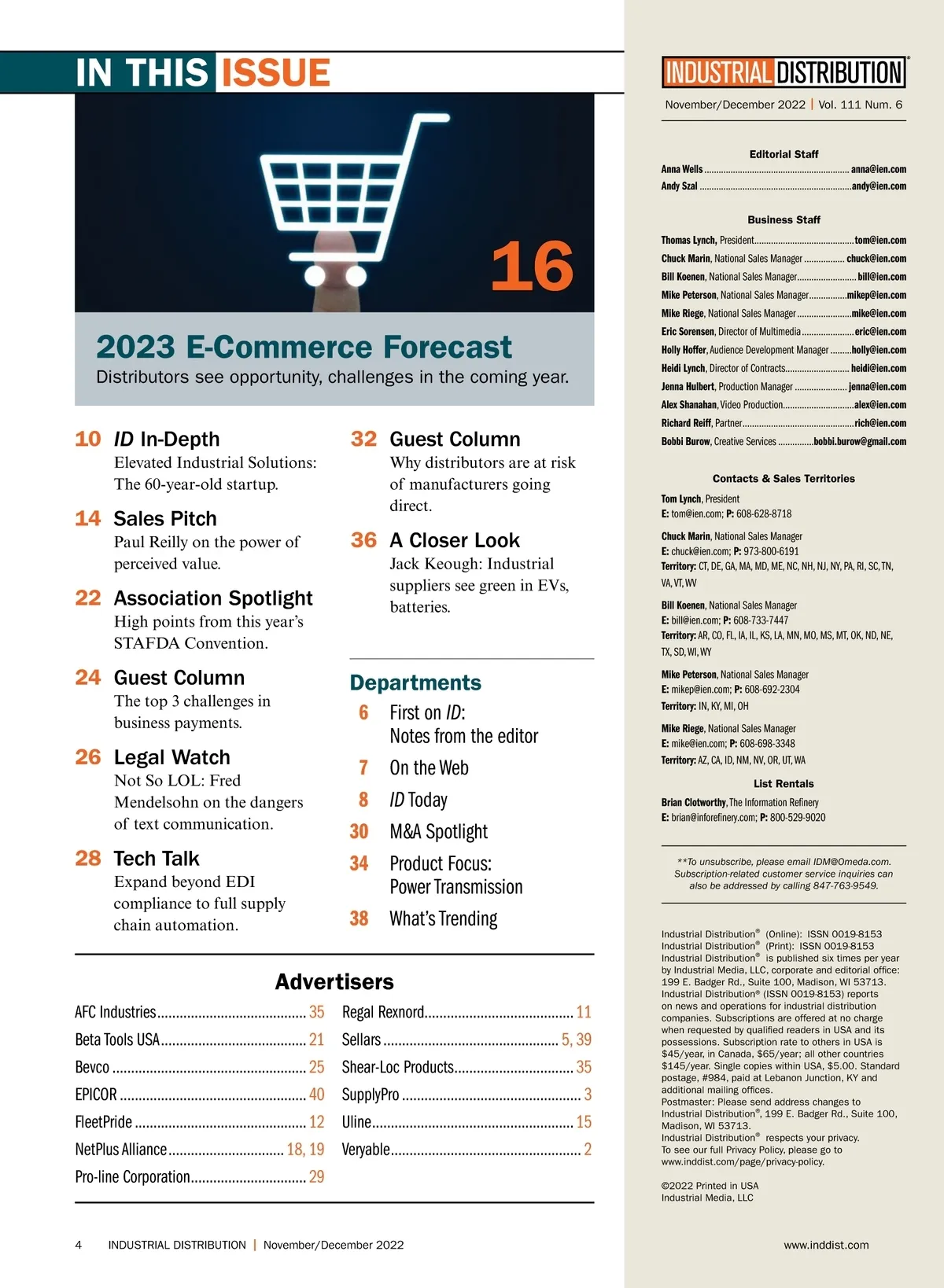 IN THIS ISSUE November/December 2022 | Vol. 111 Num. 6 Editorial Staff Anna Wells ............................................................. anna@ien.com Andy Szal ................................................................ andy@ien.com Business Staff 16 2023 E-Commerce Forecast 10 ID In-Depth Elevated Industrial Solutions: The 60-year-old startup. Thomas Lynch, President.......................................... tom@ien.com Chuck Marin , National Sales Manager ................. chuck@ien.com Bill Koenen , National Sales Manager......................... bill@ien.com Mike Peterson , National Sales Manager................ mikep@ien.com Mike Riege , National Sales Manager ....................... mike@ien.com Eric Sorensen , Director of Multimedia...................... eric@ien.com Holly Hoffer , Audience Development Manager ......... holly@ien.com Heidi Lynch , Director of Contracts........................... heidi@ien.com Jenna Hulbert , Production Manager ...................... jenna@ien.com Alex Shanahan , Video Production.............................. alex@ien.com Richard Reiff , Partner............................................... rich@ien.com Bobbi Burow , Creative Services ............... bobbi.burow@gmail.com Contacts & Sales Territories Distributors see opportunity, challenges in the coming year. 32 Guest Column Why distributors are at risk of manufacturers going direct. 14 Sales Pitch Paul Reilly on the power of perceived value. Tom Lynch , President E: tom@ien.com; P: 608-628-8718 Chuck Marin , National Sales Manager E: chuck@ien.com; P: 973-800-6191 Territory: CT, DE, GA, MA, MD, ME, NC, NH, NJ, NY, PA, RI, SC, TN, VA, VT, WV Bill Koenen , National Sales Manager E: bill@ien.com; P: 608-733-7447 Territory: AR, CO, FL, IA, IL, KS, LA, MN, MO, MS, MT, OK, ND, NE, TX, SD, WI, WY Mike Peterson , National Sales Manager E: mikep@ien.com; P: 608-692-2304 Territory: IN, KY, MI, OH Mike Riege , National Sales Manager E: mike@ien.com; P: 608-698-3348 Territory: AZ, CA, ID, NM, NV, OR, UT, WA List Rentals 36 A Closer Look Jack Keough: Industrial suppliers see green in EVs, batteries. 22 Association Spotlight High points from this year’s STAFDA Convention. 24 Guest Column The top 3 challenges in business payments. 26 Legal Watch Not So LOL: Fred Mendelsohn on the dangers of text communication. 28 Tech Talk Expand beyond EDI compliance to full supply chain automation. Departments 6 First on ID : Notes from the editor 7 On the Web 8 ID Today 30 M&A Spotlight 34 Product Focus: Power Transmission 38 What’s Trending Brian Clotworthy , The Information Refinery E: brian@inforefinery.com; P: 800-529-9020 **To unsubscribe, please email IDM@Omeda.com. Subscription-related customer service inquiries can also be addressed by calling 847-763-9549. Advertisers AFC Industries........................................ 35 Beta Tools USA....................................... 21 Bevco .................................................... 25 EPICOR .................................................. 40 FleetPride .............................................. 12 NetPlus Alliance............................... 18, 19 Pro-line Corporation............................... 29 Regal Rexnord........................................ 11 Sellars ............................................... 5, 39 Shear-Loc Products................................ 35 SupplyPro ................................................ 3 Uline...................................................... 15 Veryable................................................... 2 Industrial Distribution® (Online): ISSN 0019-8153 Industrial Distribution® (Print): ISSN 0019-8153 Industrial Distribution® is published six times per year by Industrial Media, LLC, corporate and editorial office: 199 E. Badger Rd., Suite 100, Madison, WI 53713. Industrial Distribution® (ISSN 0019-8153) reports on news and operations for industrial distribution companies. Subscriptions are offered at no charge when requested by qualified readers in USA and its possessions. Subscription rate to others in USA is $45/year, in Canada, $65/year; all other countries $145/year. Single copies within USA, $5.00. Standard postage, #984, paid at Lebanon Junction, KY and additional mailing offices. Postmaster: Please send address changes to Industrial Distribution® , 199 E. Badger Rd., Suite 100, Madison, WI 53713. Industrial Distribution® respects your privacy. To see our full Privacy Policy, please go to www.inddist.com/page/privacy-policy. ©2022 Printed in USA Industrial Media, LLC 4 INDUSTRIAL DISTRIBUTION | November/December 2022 www.inddist.com