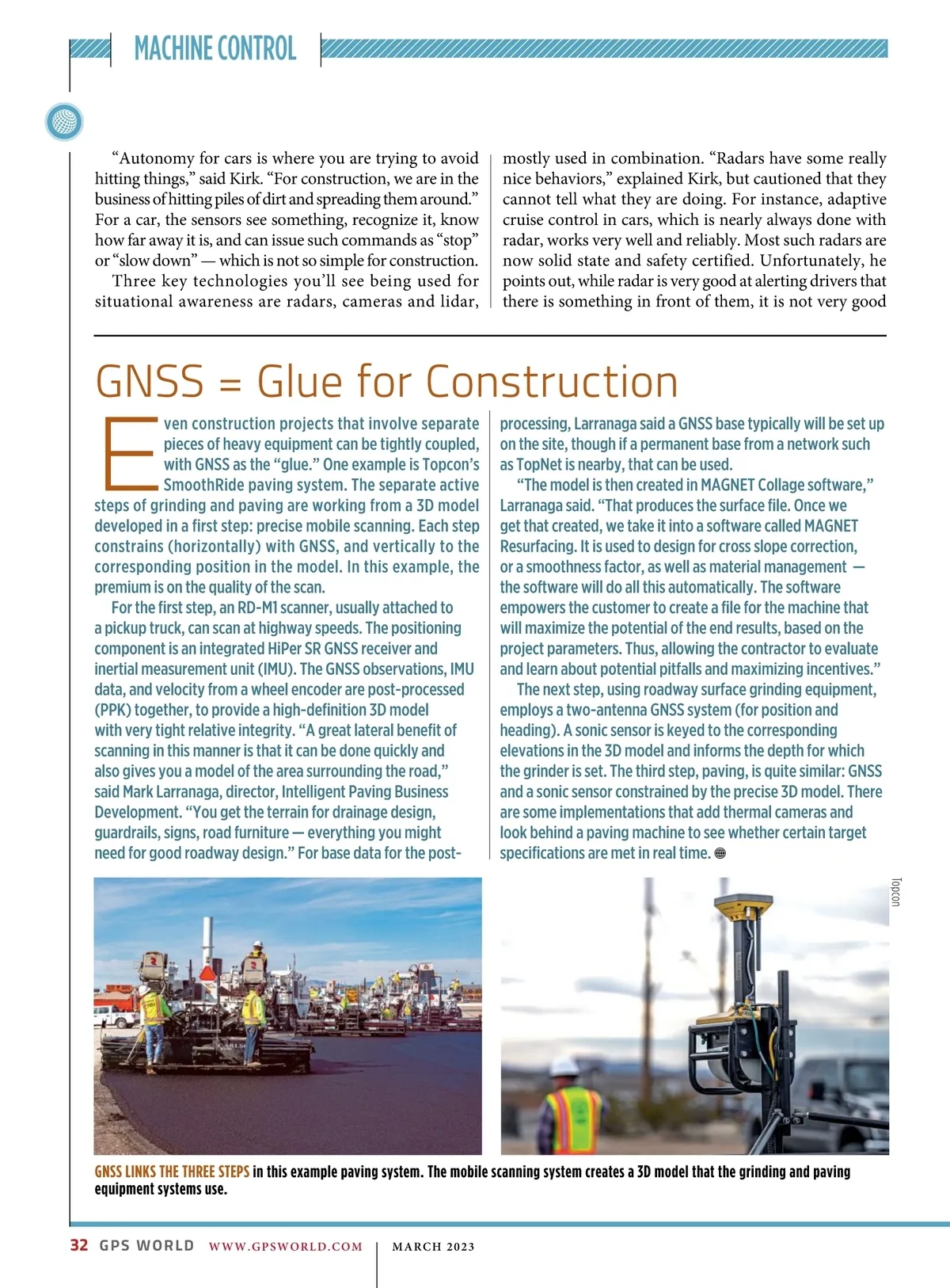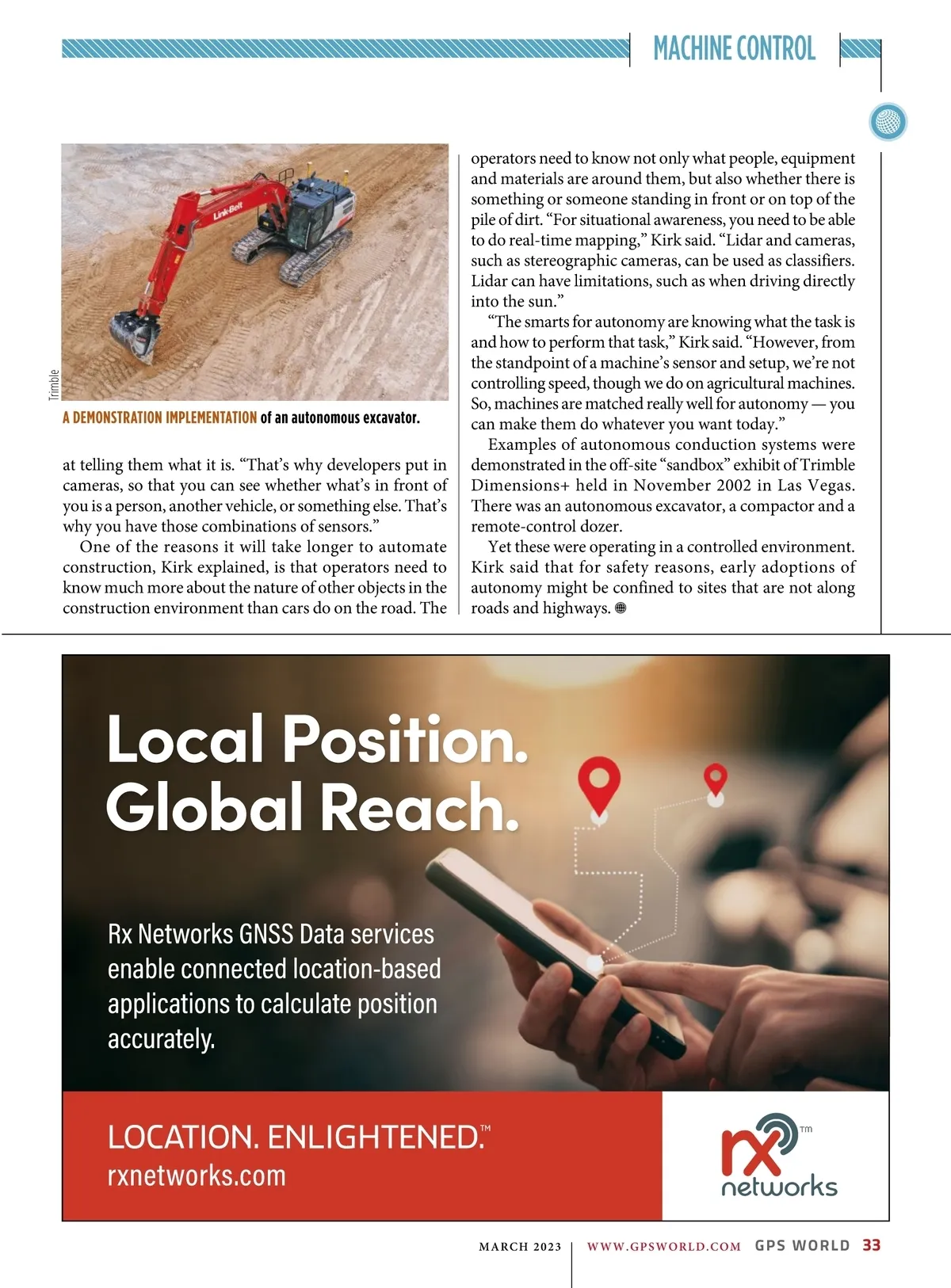 MACHINE CONTROL operators need to know not only what people, equipment and materials are around them, but also whether there is something or someone standing in front or on top of the pile of dirt. “For situational awareness, you need to be able to do real-time mapping,” Kirk said. “Lidar and cameras, such as stereographic cameras, can be used as classifiers. Lidar can have limitations, such as when driving directly into the sun.” “The smarts for autonomy are knowing what the task is and how to perform that task,” Kirk said. “However, from the standpoint of a machine’s sensor and setup, we’re not controlling speed, though we do on agricultural machines. So, machines are matched really well for autonomy — you can make them do whatever you want today.” Examples of autonomous conduction systems were demonstrated in the off-site “sandbox” exhibit of Trimble Dimensions+ held in November 2002 in Las Vegas. There was an autonomous excavator, a compactor and a remote-control dozer. Yet these were operating in a controlled environment. Kirk said that for safety reasons, early adoptions of autonomy might be confined to sites that are not along roads and highways. Trimble A DEMONSTRATION IMPLEMENTATION of an autonomous excavator. at telling them what it is. “That’s why developers put in cameras, so that you can see whether what’s in front of you is a person, another vehicle, or something else. That’s why you have those combinations of sensors.” One of the reasons it will take longer to automate construction, Kirk explained, is that operators need to know much more about the nature of other objects in the construction environment than cars do on the road. The Local Position. Global Reach. MARCH 2023 | WWW.GPSWORLD.COM GPS WORLD 33