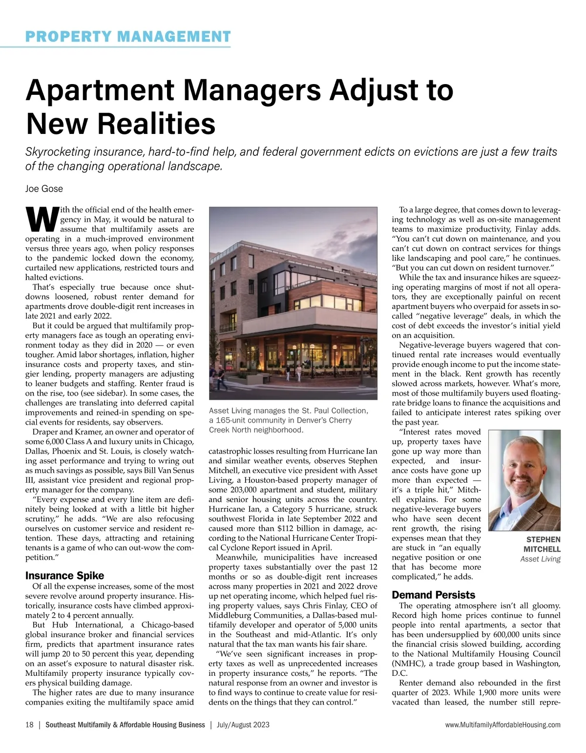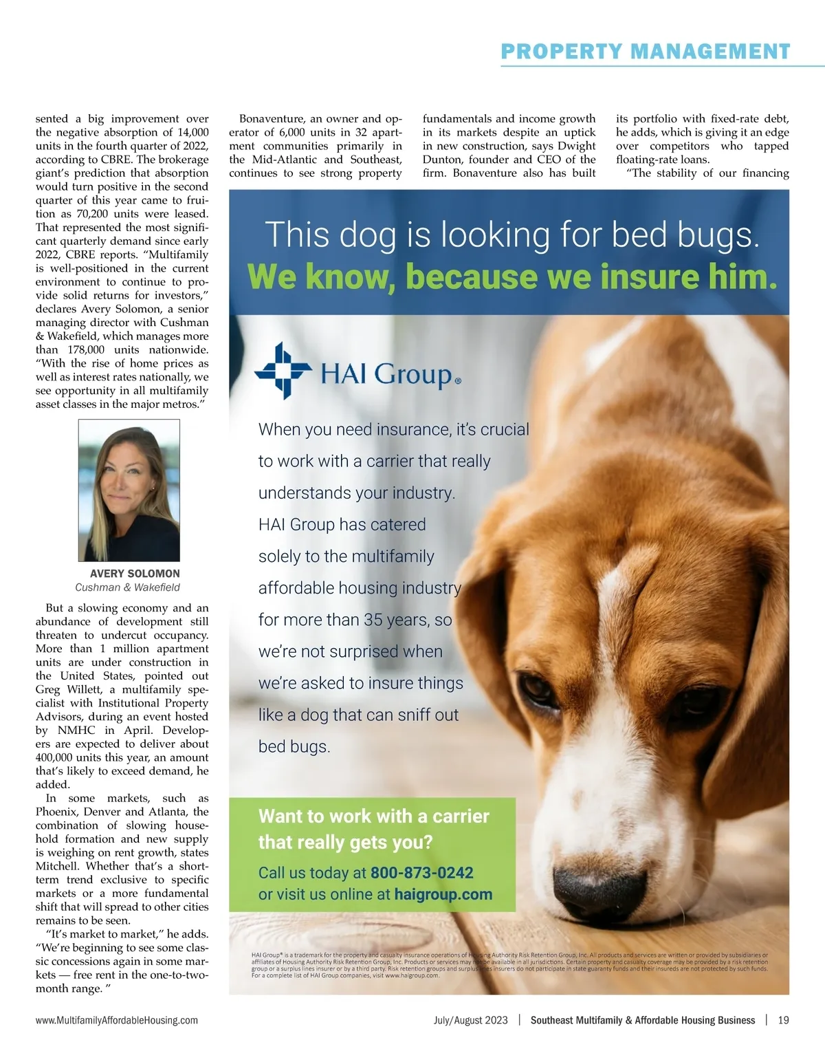 PROPERTY MANAGEMENT sented a big improvement over the negative absorption of 14,000 units in the fourth quarter of 2022, according to CBRE. The brokerage giant’s prediction that absorption would turn positive in the second quarter of this year came to frui-tion as 70,200 units were leased. That represented the most signifi -cant quarterly demand since early 2022, CBRE reports. “Multifamily is well-positioned in the current environment to continue to pro-vide solid returns for investors,” declares Avery Solomon, a senior managing director with Cushman & Wakefield, which manages more than 178,000 units nationwide. “With the rise of home prices as well as interest rates nationally, we see opportunity in all multifamily asset classes in the major metros.” Bonaventure, an owner and op-erator of 6,000 units in 32 apart-ment communities primarily in the Mid-Atlantic and Southeast, continues to see strong property fundamentals and income growth in its markets despite an uptick in new construction, says Dwight Dunton, founder and CEO of the firm. Bonaventure also has built its portfolio with fixed-rate debt, he adds, which is giving it an edge over competitors who tapped floating-rate loans. “The stability of our financing This dog is looking for bed bugs. We know, because we insure him. When you need insurance, it’s crucial to work with a carrier that really understands your industry. HAI Group has catered solely to the multifamily AVERY SOLOMON Cushman & Wakefield But a slowing economy and an abundance of development still threaten to undercut occupancy. More than 1 million apartment units are under construction in the United States, pointed out Greg Willett, a multifamily spe-cialist with Institutional Property Advisors, during an event hosted by NMHC in April. Develop-ers are expected to deliver about 400,000 units this year, an amount that’s likely to exceed demand, he added. In some markets, such as Phoenix, Denver and Atlanta, the combination of slowing house-hold formation and new supply is weighing on rent growth, states Mitchell. Whether that’s a short-term trend exclusive to specific markets or a more fundamental shift that will spread to other cities remains to be seen. “It’s market to market,” he adds. “We’re beginning to see some clas-sic concessions again in some mar-kets — free rent in the one-to-two-month range. ” www.MultifamilyAffordableHousing.com affordable housing industry for more than 35 years, so we’re not surprised when we’re asked to insure things like a dog that can sniff out bed bugs. Want to work with a carrier that really gets you? Call us today at 800-873-0242 or visit us online at haigroup.com HAI Group® is a trademark for the property and casualty insurance operations of Housing Authority Risk Retention Group, Inc. All products and services are written or provided by subsidiaries or affiliates of Housing Authority Risk Retention Group, Inc. Products or services may not be available in all jurisdictions. Certain property and casualty coverage may be provided by a risk retention group or a surplus lines insurer or by a third party. Risk retention groups and surplus lines insurers do not participate in state guaranty funds and their insureds are not protected by such funds. For a complete list of HAI Group companies, visit www.haigroup.com. July/August 2023 | Southeast Multifamily & Affordable Housing Business | 19