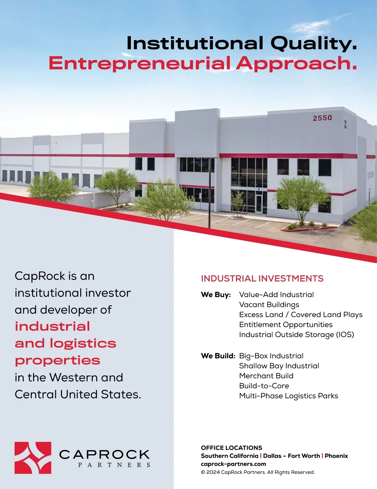 Institutional Quality. Entrepreneurial Approach. CapRock is an institutional investor and developer of industrial and logistics properties in the Western and Central United States. INDUSTRIAL INVESTMENTS We Buy: Value-Add Industrial Vacant Buildings Excess Land / Covered Land Plays Entitlement Opportunities Industrial Outside Storage (IOS) We Build: Big-Box Industrial Shallow Bay Industrial Merchant Build Build-to-Core Multi-Phase Logistics Parks OFFICE LOCATIONS Southern California | Dallas – Fort Worth | Phoenix caprock-partners.com © 2024 CapRock Partners. All Rights Reserved.