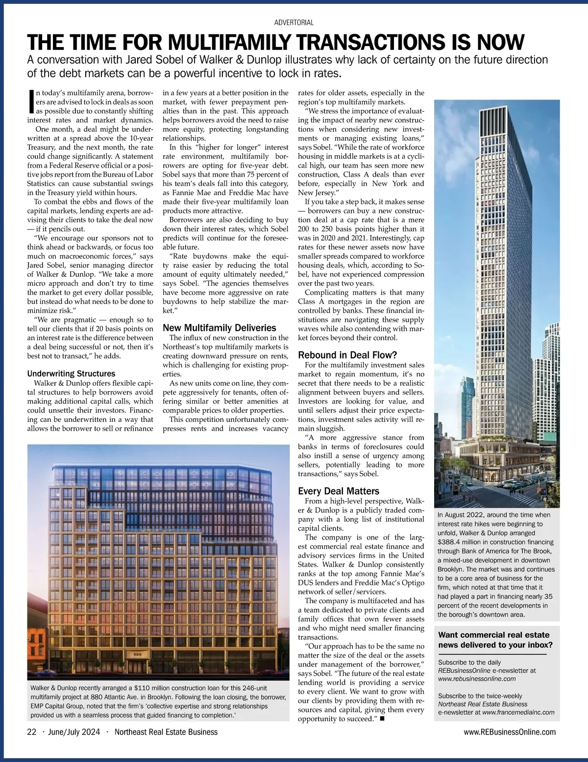 ADVERTORIAL THE TIME FOR MULTIFAMILY TRANSACTIONS IS NOW A conversation with Jared Sobel of Walker & Dunlop illustrates why lack of certainty on the future direction of the debt markets can be a powerful incentive to lock in rates. I n today’s multifamily arena, borrow-ers are advised to lock in deals as soon as possible due to constantly shifting interest rates and market dynamics. One month, a deal might be under-written at a spread above the 10-year Treasury, and the next month, the rate could change significantly. A statement from a Federal Reserve official or a posi -tive jobs report from the Bureau of Labor Statistics can cause substantial swings in the Treasury yield within hours. To combat the ebbs and flows of the capital markets, lending experts are ad-vising their clients to take the deal now — if it pencils out. “We encourage our sponsors not to think ahead or backwards, or focus too much on macroeconomic forces,” says Jared Sobel, senior managing director of Walker & Dunlop. “We take a more micro approach and don’t try to time the market to get every dollar possible, but instead do what needs to be done to minimize risk.” “We are pragmatic — enough so to tell our clients that if 20 basis points on an interest rate is the difference between a deal being successful or not, then it’s best not to transact,” he adds. in a few years at a better position in the market, with fewer prepayment pen-alties than in the past. This approach helps borrowers avoid the need to raise more equity, protecting longstanding relationships. In this “higher for longer” interest rate environment, multifamily bor-rowers are opting for five-year debt. Sobel says that more than 75 percent of his team’s deals fall into this category, as Fannie Mae and Freddie Mac have made their five-year multifamily loan products more attractive. Borrowers are also deciding to buy down their interest rates, which Sobel predicts will continue for the foresee-able future. “Rate buydowns make the equi-ty raise easier by reducing the total amount of equity ultimately needed,” says Sobel. “The agencies themselves have become more aggressive on rate buydowns to help stabilize the mar-ket.” New Multifamily Deliveries Underwriting Structures Walker & Dunlop offers flexible capi -tal structures to help borrowers avoid making additional capital calls, which could unsettle their investors. Financ-ing can be underwritten in a way that allows the borrower to sell or refinance The influx of new construction in the Northeast’s top multifamily markets is creating downward pressure on rents, which is challenging for existing prop-erties. As new units come on line, they com -pete aggressively for tenants, often of-fering similar or better amenities at comparable prices to older properties. This competition unfortunately com-presses rents and increases vacancy rates for older assets, especially in the region’s top multifamily markets. “We stress the importance of evaluat-ing the impact of nearby new construc-tions when considering new invest-ments or managing existing loans,” says Sobel. “While the rate of workforce housing in middle markets is at a cycli-cal high, our team has seen more new construction, Class A deals than ever before, especially in New York and New Jersey.” If you take a step back, it makes sense — borrowers can buy a new construc-tion deal at a cap rate that is a mere 200 to 250 basis points higher than it was in 2020 and 2021. Interestingly, cap rates for these newer assets now have smaller spreads compared to workforce housing deals, which, according to So-bel, have not experienced compression over the past two years. Complicating matters is that many Class A mortgages in the region are controlled by banks. These financial in -stitutions are navigating these supply waves while also contending with mar-ket forces beyond their control. Rebound in Deal Flow? For the multifamily investment sales market to regain momentum, it’s no secret that there needs to be a realistic alignment between buyers and sellers. Investors are looking for value, and until sellers adjust their price expecta-tions, investment sales activity will re-main sluggish. “A more aggressive stance from banks in terms of foreclosures could also instill a sense of urgency among sellers, potentially leading to more transactions,” says Sobel. Every Deal Matters Walker & Dunlop recently arranged a $110 million construction loan for this 246-unit multifamily project at 880 Atlantic Ave. in Brooklyn. Following the loan closing, the borrower, EMP Capital Group, noted that the firm’s ‘collective expertise and strong relationships provided us with a seamless process that guided financing to completion.’ From a high-level perspective, Walk-er & Dunlop is a publicly traded com-pany with a long list of institutional capital clients. The company is one of the larg-est commercial real estate finance and advisory services firms in the United States. Walker & Dunlop consistently ranks at the top among Fannie Mae’s DUS lenders and Freddie Mac’s Optigo network of seller/servicers. The company is multifaceted and has a team dedicated to private clients and family offices that own fewer assets and who might need smaller financing transactions. “Our approach has to be the same no matter the size of the deal or the assets under management of the borrower,” says Sobel. “The future of the real estate lending world is providing a service to every client. We want to grow with our clients by providing them with re-sources and capital, giving them every opportunity to succeed.” In August 2022, around the time when interest rate hikes were beginning to unfold, Walker & Dunlop arranged $388.4 million in construction financing through Bank of America for The Brook, a mixed-use development in downtown Brooklyn. The market was and continues to be a core area of business for the firm, which noted at that time that i