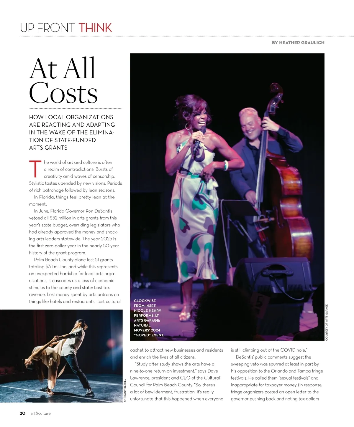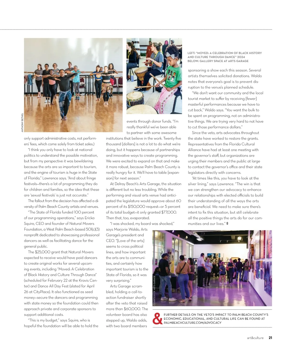 LEFT: “MOVED: A CELEBRATION OF BLACK HISTORY AND CULTURE THROUGH DANCE” 2024 BELOW: GALLERY SPACE AT ARTS GARAGE only support administrative costs, not perform-ers’ fees, which come solely from ticket sales.) “I think you only have to look at national politics to understand the possible motivation, but from my perspective it was bewildering because the arts are so important to tourism, and the engine of tourism is huge in the State of Florida,” Lawrence says. “And about fringe festivals—there’s a lot of programming they do for children and families, so the idea that these are ‘sexual festivals’ is just not accurate.” The fallout from the decision has affected a di-versity of Palm Beach County artists and venues. “The State of Florida funded 100 percent of our programming operations,” says Ericka Squire, CEO and founder of Natural Movers Foundation, a West Palm Beach–based 501(c)(3) nonprofit dedicated to showcasing professional dancers as well as facilitating dance for the general public. The $25,000 grant that Natural Movers expected to receive would have paid dancers to create original works for several upcom-ing events, including “Moved: A Celebration of Black History and Culture Through Dance” (scheduled for February 22 at the Kravis Cen-ter) and Dance All Day Fest (slated for April 26 at CityPlace). It also functioned as seed money—secure the dancers and programming with state money so the foundation could then approach private and corporate sponsors to support additional costs. “This is my budget,” says Squire, who is hopeful the foundation will be able to hold the events through donor funds. “I’m really thankful we’ve been able to partner with some awesome institutions that believe in the work. Twenty-five thousand [dollars] is not a lot to do what we’re doing, but it happens because of partnerships and innovative ways to create programming. We were excited to expand on that and make it more robust, because Palm Beach County is really hungry for it. We’ll have to table [expan-sion] for next season.” At Delray Beach’s Arts Garage, the situation is different but no less troubling. While the performing and visual arts venue had antici-pated the legislature would approve about 60 percent of its $150,000 request—or 5 percent of its total budget—it only granted $77,000. Then that, too, evaporated. “I was shocked, my board was shocked,” says Marjorie Waldo, Arts Garage’s president and CEO. “[Love of the arts] seems to cross political lines, and how important the arts are to communi-ties, and certainly how important tourism is to the State of Florida, so it was very surprising.” Arts Garage scram-bled, holding a call-to-action fundraiser shortly after the veto that raised more than $60,000. The FURTHER DETAILS ON THE VETO’S IMPACT TO PALM BEACH COUNTY’S volunteer board has also ECONOMIC, EDUCATIONAL, AND CULTURAL LIFE CAN BE FOUND AT stepped up, Waldo adds, PALMBEACHCULTURE.COM/ADVOCACY with two board members sponsoring a show each this season. Several artists themselves solicited donations. Waldo notes that everyone’s goal is to prevent dis-ruption to the venue’s planned schedule. “We don’t want our community and the local tourist market to suffer by receiving [fewer] masterful performances because we have to cut back,” Waldo says. “You want the bulk to be spent on programming, not on administra-tive things. We are trying very hard to not have to cut those performance dollars.” Since the veto, arts advocates throughout the state have worked to restore the grants. Representatives from the Florida Cultural Alliance have had at least one meeting with the governor’s staff, but organizations are urging their members and the public at large to contact the governor’s office and their state legislators directly with concerns. “At times like this, you have to look at the silver lining,” says Lawrence. “The win is that we can strengthen our advocacy to enhance our relationships with elected officials to build their understanding of all the ways the arts are beneficial. We need to make sure there’s intent to fix this situation, but still celebrate all the positive things the arts do for our com-munities and our lives.” ‡ ANTHONY BETHEL & COURTESY OF ARTS GARAGE art&culture 21