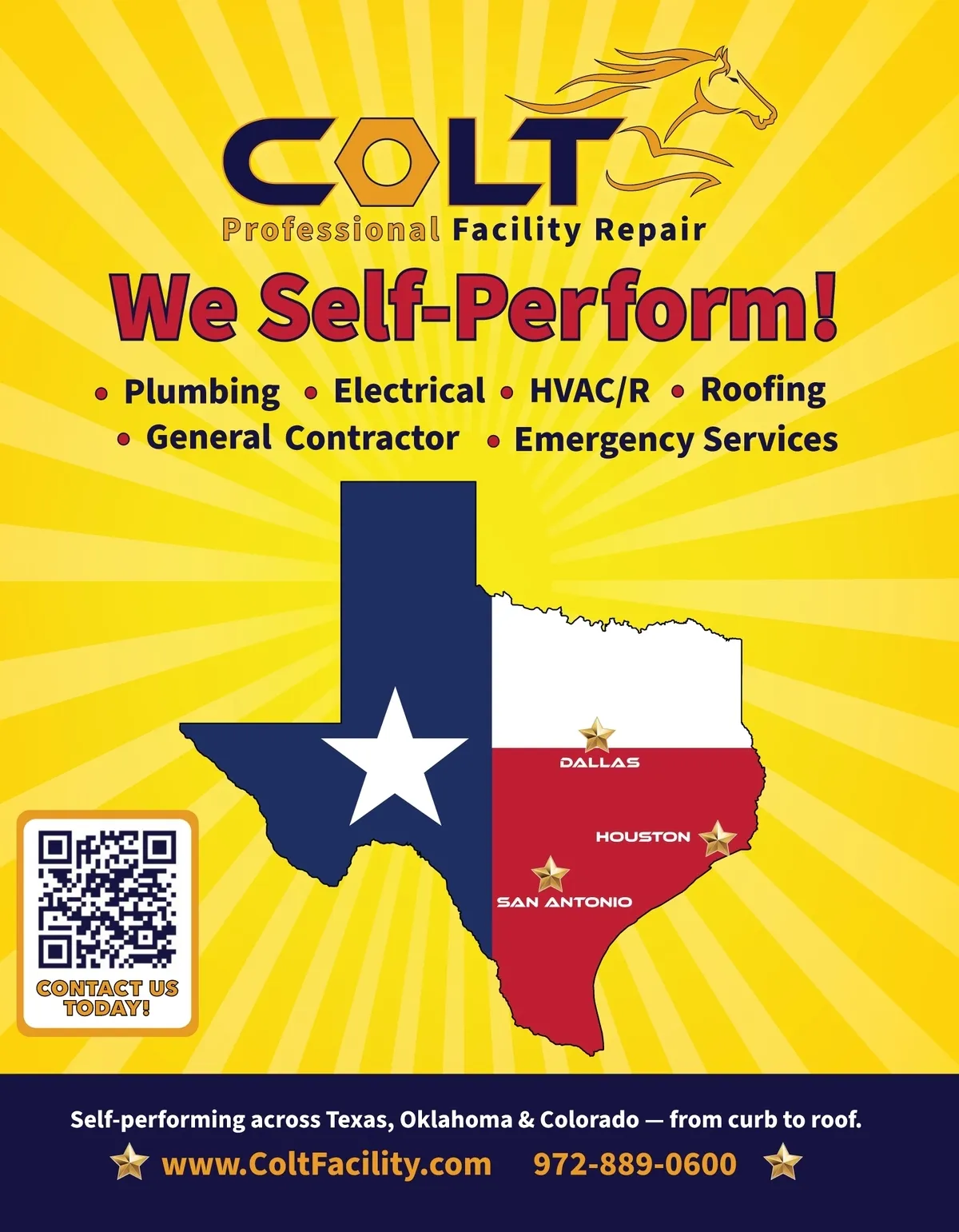 CONTACT US TODAY! Self-performing across Texas, Oklahoma & Colorado — from curb to roof. www.ColtFacility.com 972-889-0600